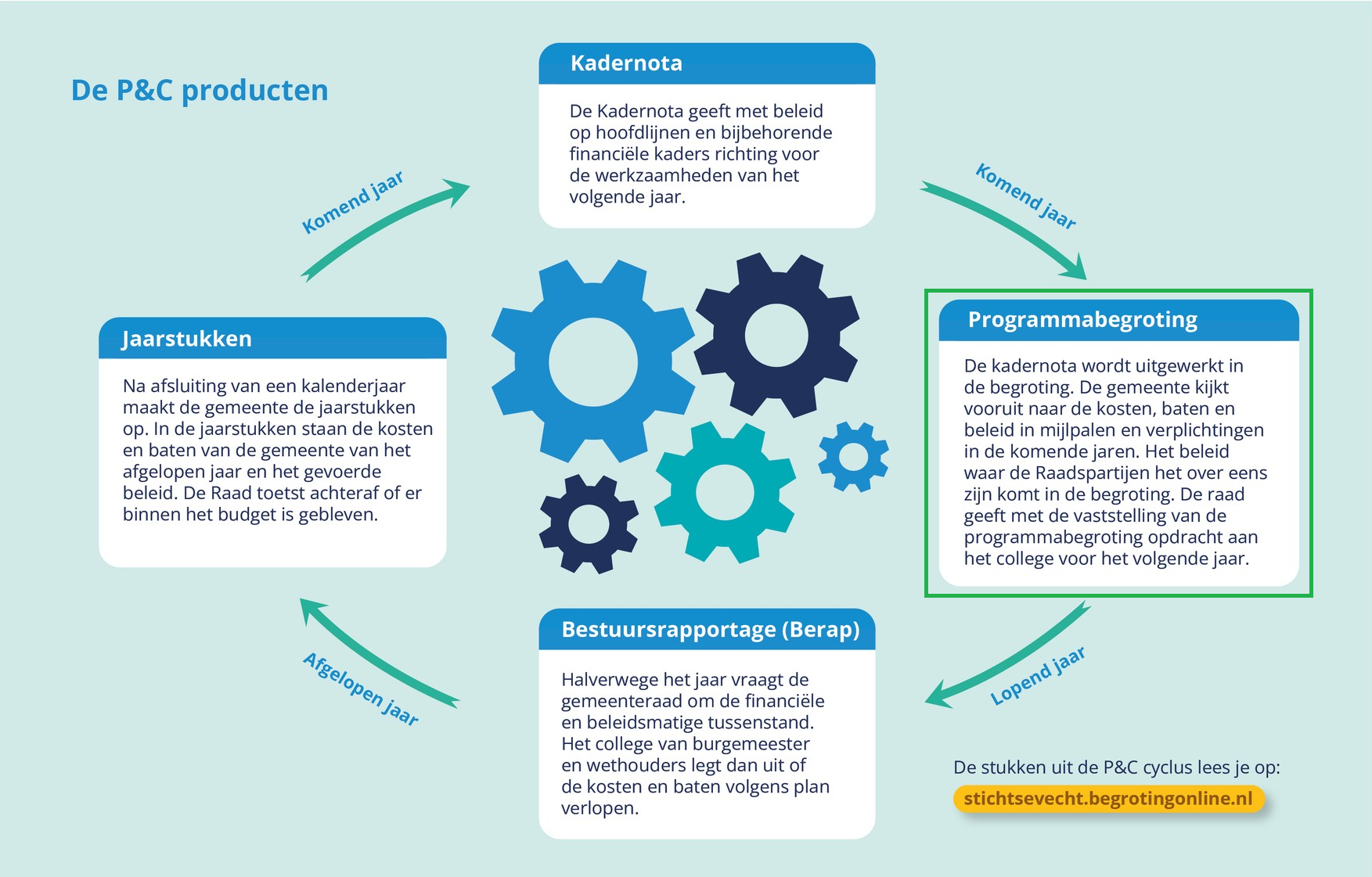 De Programmabegroting is onderdeel van de planning- en controlcyclus. Deze cyclus is een jaarlijks terugkerende cyclus waarin we vooruitblikken op de komende jaren (planning) en terugkijken op het afgelopen jaar (control). Het gaat om de taken die we uitvoeren, de resultaten die we samen hebben bereikt én nog gaan bereiken en dat met een solide financiële basis. Als gemeente streven we naar transparantie met concrete en meetbare effecten.